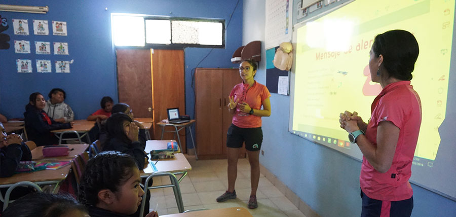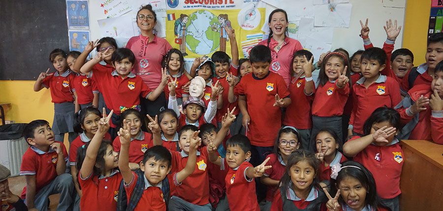 Lorsque les filles sont arrivées dans la ville de San Pedro de Atacama, elles ont eu l’impression de changer de pays, alors qu’elles étaient encore au Chili. Mais le désert d’Atacama étant le plus aride du monde, le paysage et le climat sont très différents. D’ailleurs, elles ont profité du temps pour aller pédaler dans la Vallée de la Lune. Elles ont aussi pu intervenir dans l’école de San Pedro afin de sensibiliser deux classes aux gestes qui sauvent. Pour cela, elles étaient accompagnées de Paolina, professeur d’anglais. Le matin était dédié aux élèves de 10 ans et l’après-midi à ceux de 7 ans. Tous ont été très réceptifs et se sont pris au jeu. Les plus grands ont été confrontés à des mises en scène où ils jouaient le rôle des sauveteurs. Pour les plus jeunes, Mélanie et Maud ont privilégié des discussions autour des risques du quotidien à la maison et à l’extérieur, la diffusion d’une courte vidéo ainsi que l’apprentissage de l’alerte. Des moments de détente ont aussi eu lieu, avec au programme des avions en papier (pour le plus grand bonheur des enfants et surtout de nos deux Valis’Help !) et des dessins. Pour nos deux expertes en premiers secours, ces instants sont toujours riches en émotions et en amour, et cela leur fait chaud au cœur.