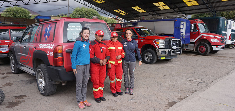 Après cette action dans l’école, elles ont rencontré les 18 sapeurs-pompiers de San Pedro, dont 6 femmes. Dans cette caserne chilienne, l’équipement et le matériel sont meilleurs que dans d’autres, cette dernière ayant bénéficié d’une aide gouvernementale pour l’achat d’engins. Ces pompiers sont spécialisés dans les interventions en milieux périlleux dans les montages. Mais comme ils ne disposent malheureusement pas d’hélicoptère, l’accès aux secours peut prendre du temps.