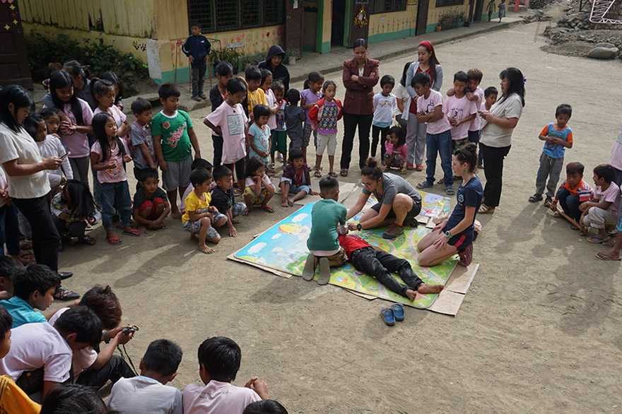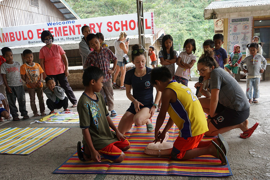 Puis, elles ont rejoint le Nord de Luzon et plus précisément le village de Banaue. Durant trois jours, elles ont réalisé un trek à travers les rizières, avec une halte au village assez retiré de Cambulo où elles ont initié aux gestes qui sauvent durant deux heures les enfants de l’école, qui étaient très intrigués. Pour cela, elles ont utilisé leur matériel dont le mannequin fourni par Defibril. Cette séance d’initiation a été aussi très enrichissante pour Maud et Mélanie, qui ont appris comment les services d’urgence était alertés … sans numéro d’urgence direct ! Leur deuxième étape a eu lieu à Batad, un village suspendu dans les rizières. Elles ont pu enseigner les gestes de secourisme à 130 élèves de 6 à 12 ans. Pour le dernier jour de leur trek, elles ont visité avec leur guide l’office de sauvetage dont il membre, et qui possède du matériel d’évacuation pour faire face aux nombreux typhons et coulées de boues dévastatrices. A leur retour à Banaue, elles en ont profité pour rencontrer les pompiers locaux et le « bureau municipal de réduction et de gestion des risques liés aux catastrophes naturelles ».